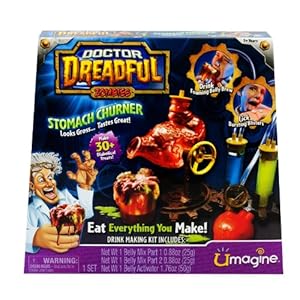 Bring Doctor Dreadful’s Stomach Churner to life as it pours out foamy cherry colon cola! Watch the stomach juices change color as it is pumped through the tubes. Create zombie warts and stomach acids to share with family and friends. It looks gross and tastes delicious! Experiment with Doctor Dreadful’s Stomach Churner for foul fun and great taste! Ages 7+. No batteries required.