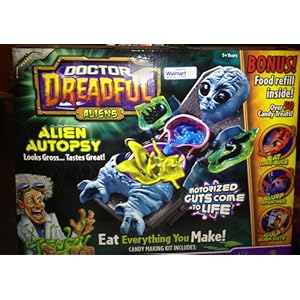 The Doctor Dreadful Alien Autopsy Bonus Pack is the doctor's most disgusting & tasty experiments yet. Make tasty eyes, inject lung bugs, & watch guts come to life. Make some disgusting food and gross out your friends! Set includes; alien, alien base, food injector, 2 lung bug molds, belly pan, stir-stick/scoop, measuring cup, 5 packages of candy mix & instructions.